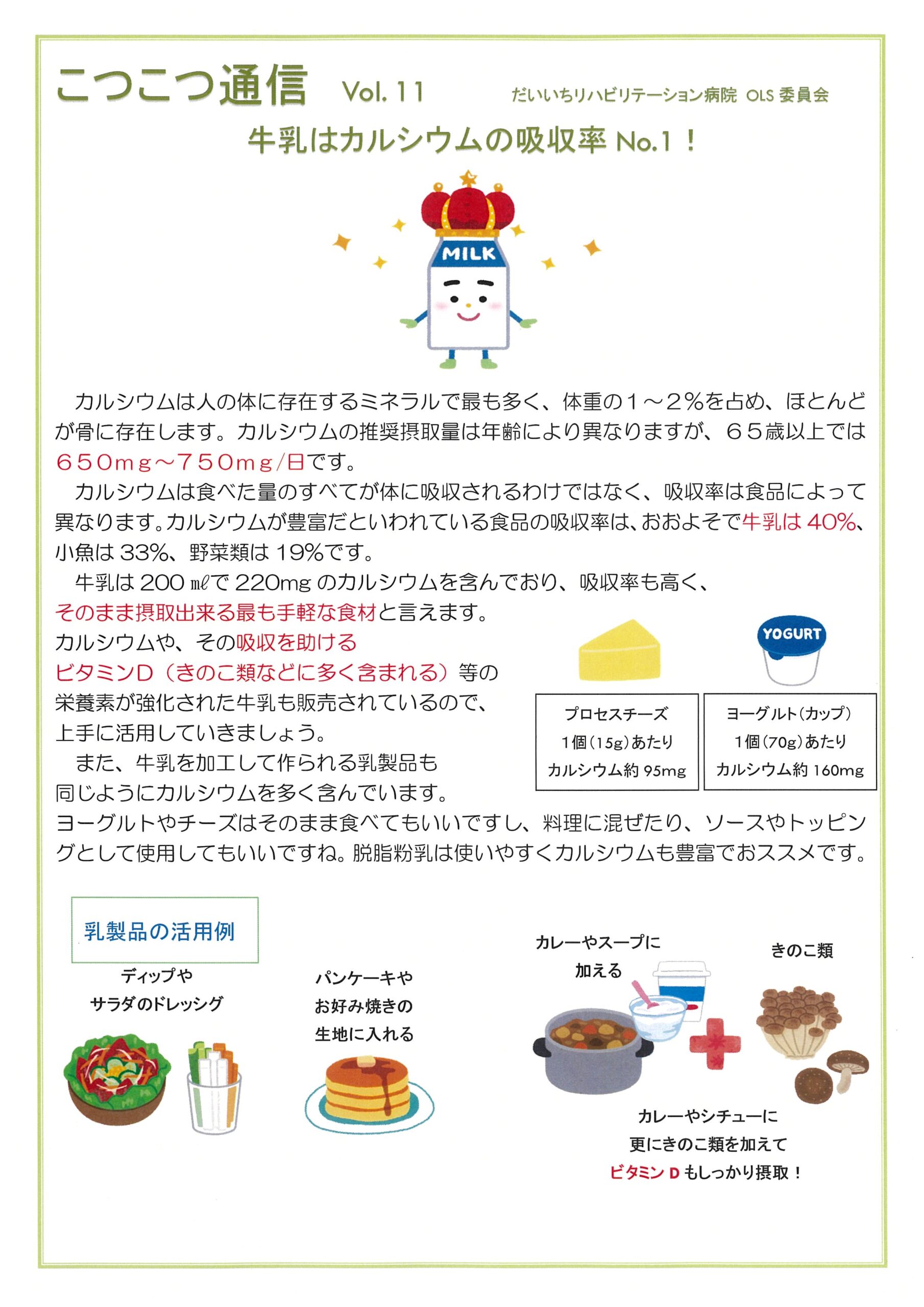 kotsukotsu newsこつこつ通信 ホーム > こつこつ通信 > こつこつ通信 vol.11 牛乳はカルシウムの吸収率No.1! こつこつ通信 vol.11 牛乳はカルシウムの吸収率No.1! 骨粗鬆症(こつそしょうしょう)についての豆知識をまとめた、こつこつ通信は毎月1回の発行です。 こつこつ通信一覧に戻る