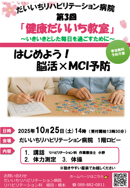 newsお知らせ ホーム > お知らせ > 参加無料予約不要!第3回「だいいち健康教室」開催のお知らせ 参加無料予約不要!第3回「だいいち健康教室」開催のお知らせ 第3回目は『はじめよう!脳活×MCI(軽度認知障害)予防』についてです。 MCI(軽度認知症害)について一緒に学びましょう!! 日時:R7.10.25(土)14時 (受付開始13時30分) 場所:だいいちリハビリテーション病院 1Fロビー 参加費無料で予約不要です。ぜひご参加ください。 ← 前の記事へ 次の記事へ → お知らせ一覧に戻る